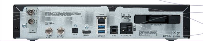 Из интерфейсов в тюнере стоит HDMI порт версией 2.0 (UltraHD), два USB порта версии 3.0, о один с версией 2.0, оптический цифровой аудиовыход S/PDIF, Ethernet (Gigabit) и карман для подключения HDD 2,5''